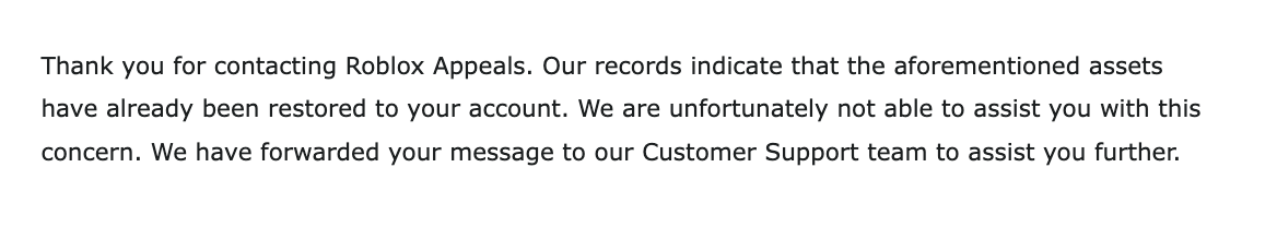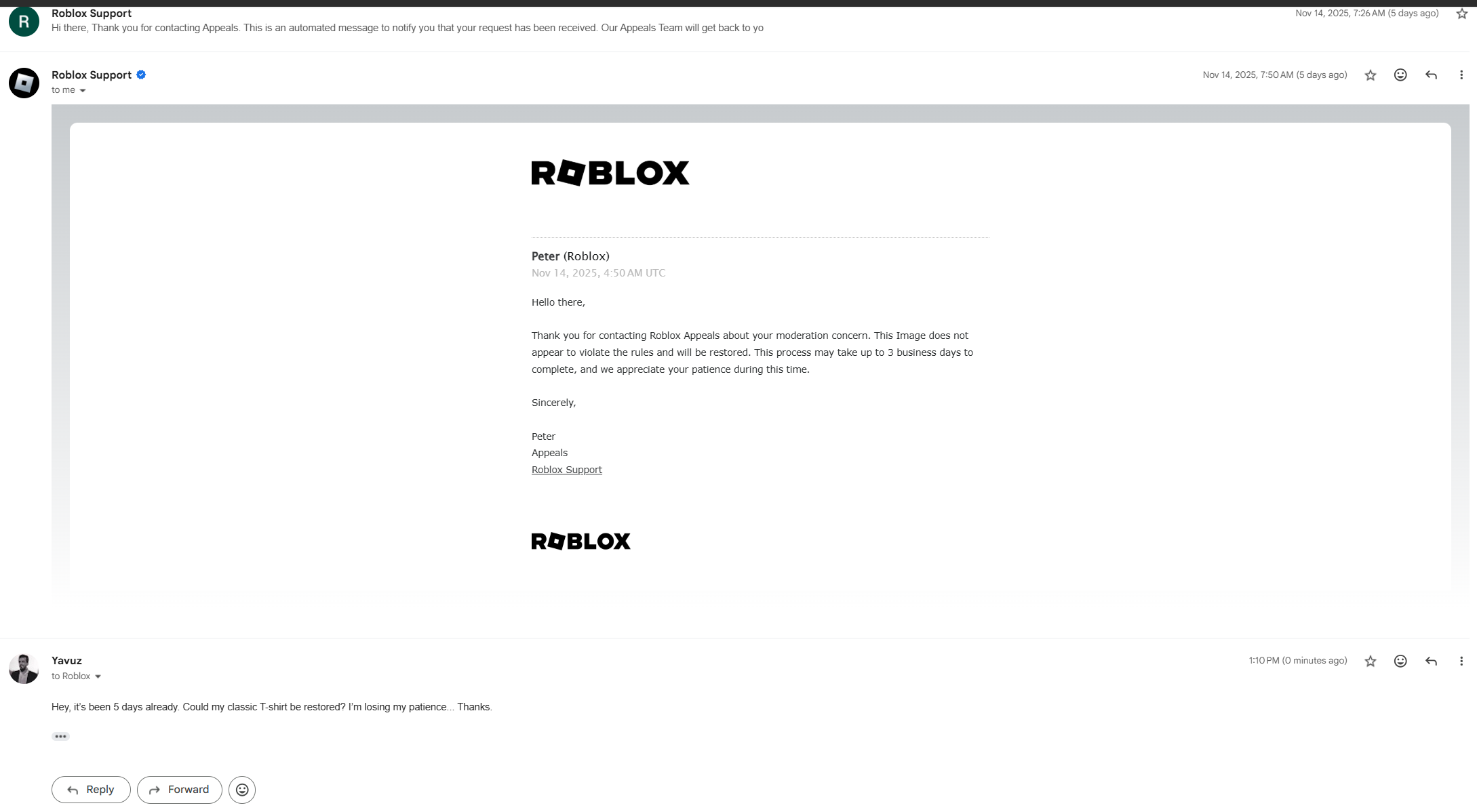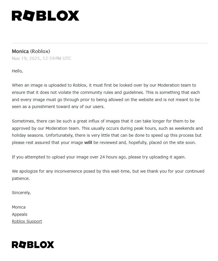 EDIT: I have also sent an email directly to Roblox Support because of the length of time it has already taken since posting this Bug Report on the Dev Forum. It’s not an avenue I wanted to go down, but I am getting very impatient.