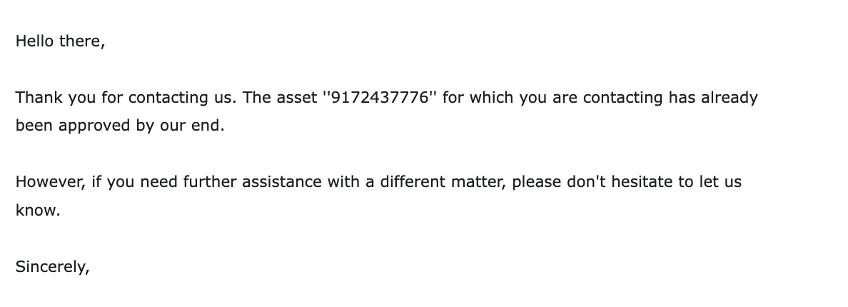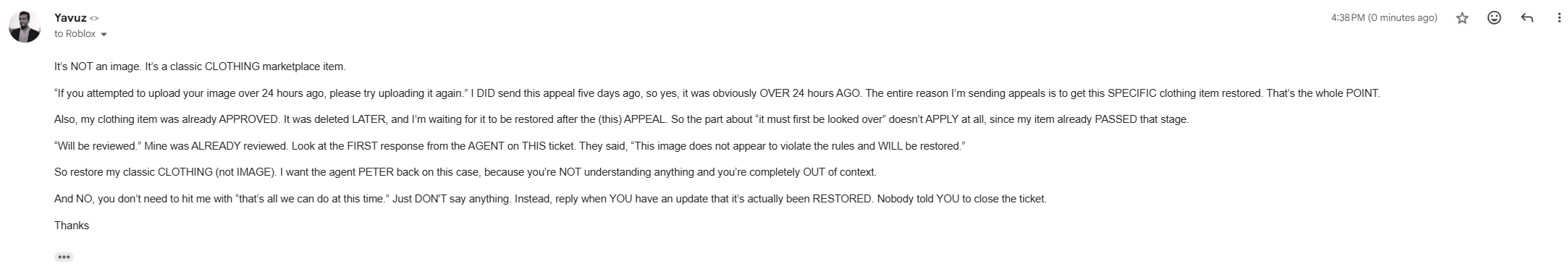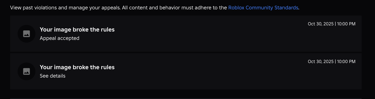 I’ve been waiting now for over 12 hours to have both the account and the asset reinstated only to notice the same ban on the same asset is listed twice on the violations and appeals page.