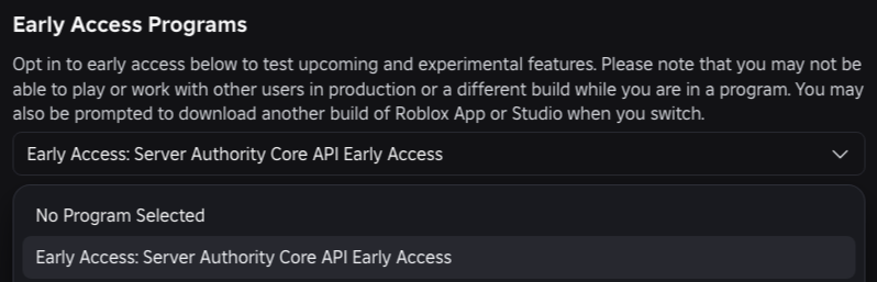 Enable the Server Authority early access preview by visiting roblox.com and enabling the preview in the Early Access section of the account settings page. (For more info on Early Access, go here)