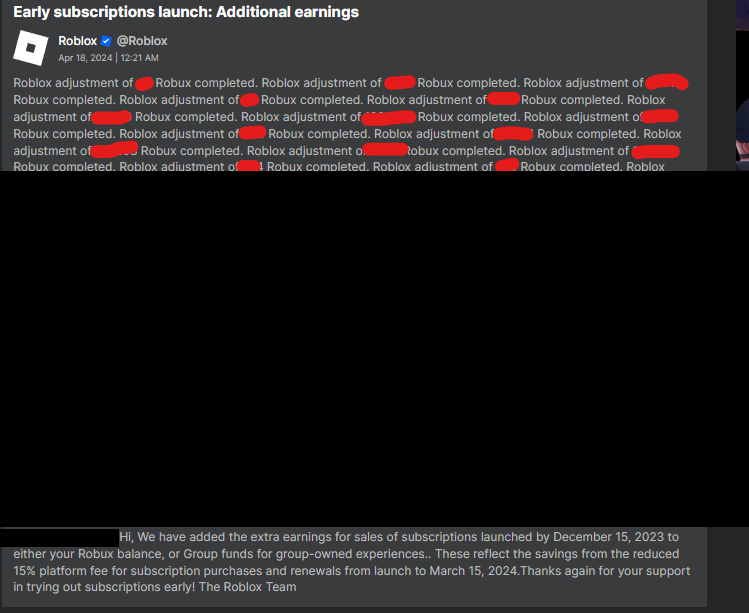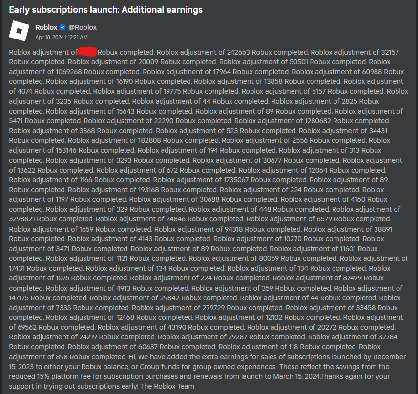 i got a message from roblox with the title “Early subscriptions launch: Additional earnings” and and with many robux amounts with the text “Roblox adjustment of … Robux completed” and with the text “Hi, We have added the extra earnings for sales of subscriptions launched by December 15, 2023 to either your Robux balance, or Group funds for group-owned experiences… These reflect the savings from the reduced 15% platform fee for subscription purchases and renewals from launch to March 15, 2024.Thanks again for your support in trying out subscriptions early! The Roblox Team”