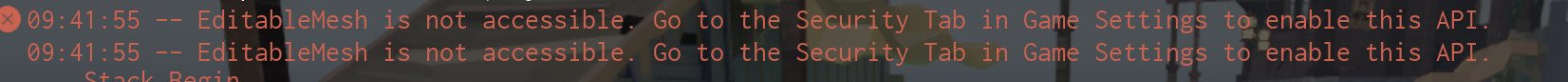 Running any of the APIs regarding EditableMesh will return the error “EditableMesh is not accessible. Go to the Security Tab in Game Settings to enable this API.” despite the setting being very much enabled. This appears to be happening to all players in my game, including myself, and does not happen in Studio.