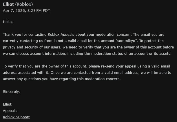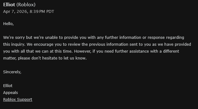 I expect a proper response while appealing through Roblox Support of my appeal to be either accepted or rejected.