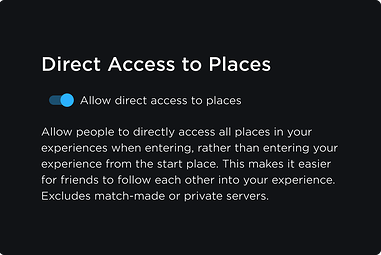 When you enable this setting, you will be able to send your users to non-root places when they join. Users can join non-root places directly through joining a friend already on that server, experience invite links, developer prompted invites, or by choosing that server on the server list.