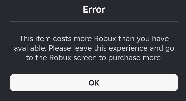 Alternatively the error popup should allow for opening up a webview that shows the purchase robux page, with a choice saying “Open Robux Page”. Which would be an overall better UX than just telling people to leave the game to buy robux.