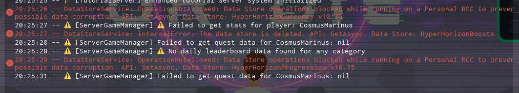 DataStoreService: OperationNotAllowed: Data Store operations blocked while running on a Personal RCC to prevent possible data corruption. API: UpdateAsync, Data Store: psData Project Smash - Roblox