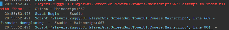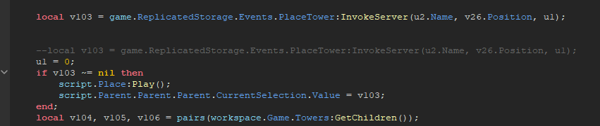 when the invoke plays its when you do not have a current tower selected. the only way current selection is nil is if you do not have a currently placed active tower in workspace selected, to upgrade ect or see the range part. So when v103 = nil/invoked its when you want u2/u2.Name to be created Tower placed into game.workspace.Game.towers from the server scright right??