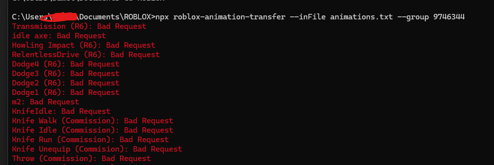 I’ve been using the evaera animation transfer tool ( GitHub - evaera/roblox-animation-transfer: Transfers Roblox animations from one owner to another. ; Transfer animations | Documentation - Roblox Creator Hub ) and I got it to work, however, it only seems to detect and re-upload animations that Roblox has made, such as Climbing, sitting and other default Roblox animations. Animations that I own are thrown out as the following error. How can I fix this?