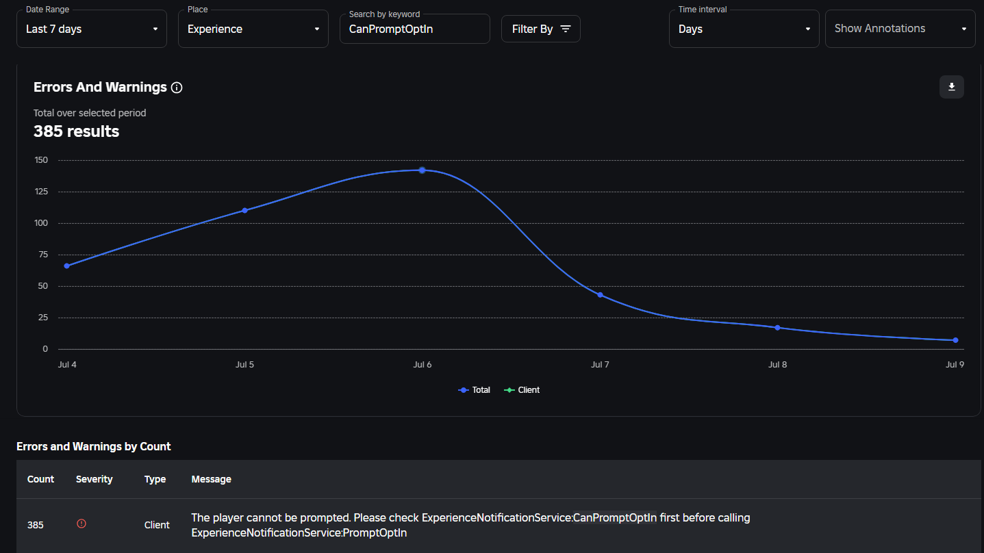 We’ve received some errors in a game The player cannot be prompted. Please check ExperienceNotificationService:CanPromptOptIn first before calling ExperienceNotificationService:PromptOptIn