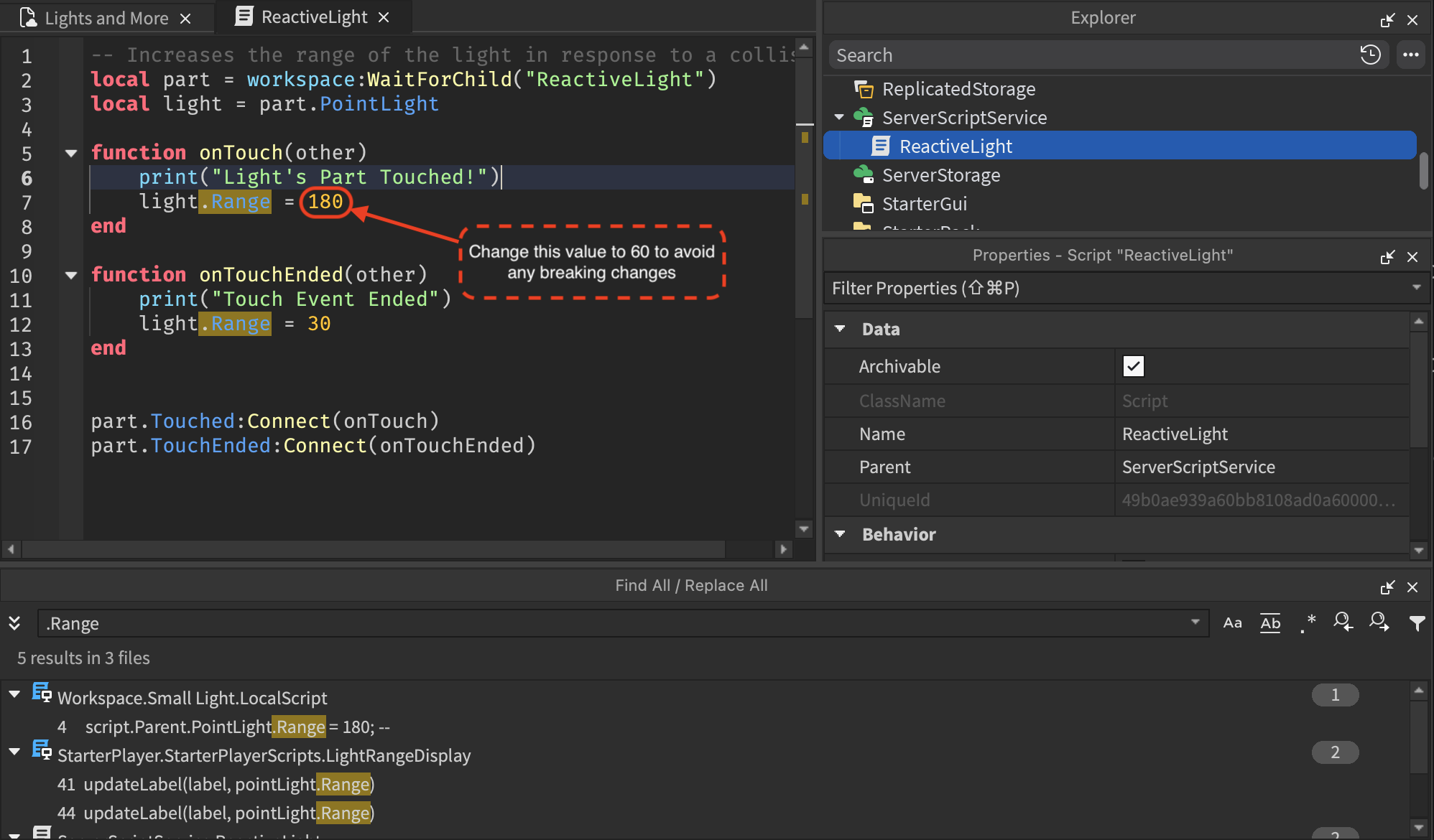 We recommend using the Find All function (Command + Shift + F / CTRL + Shift + F) in Studio and looking for “.Range” to ensure that all light range values are set to less than or equal to 60 to avoid any breaking changes.
