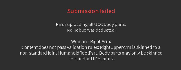 After clicking “Publish,” Roblox Studio shows this error: “Content does not pass validation rules: RightUpperArm is skinned to a non-standard joint HumanoidRootPart. Body parts may only be skinned to standard R15 joints.”
