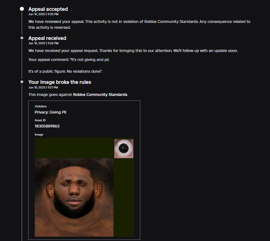 The texture for 18306006580 ( Lebron James) was violated for sharing personal information. I appealed, and it was accepted. A few days later, it still hasn’t been restored.+