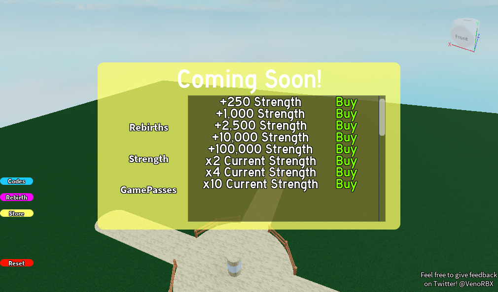 Like every one of them, except the last one. The font looks a bit off, as well as the texts are way too close together. Let’s say if someone wanted to buy +1,000 Strength, but since the Buy buttons are too close together they accidentally clicked on the +250 Strength Buy button. That’s a big problem, so you should space the Buy buttons and Strength buttons out more. A long with the Rebirths, Strength, and GamePasses option. You should change the font on those, as well as place them better. With these changes, your GUIs will look a lot better.