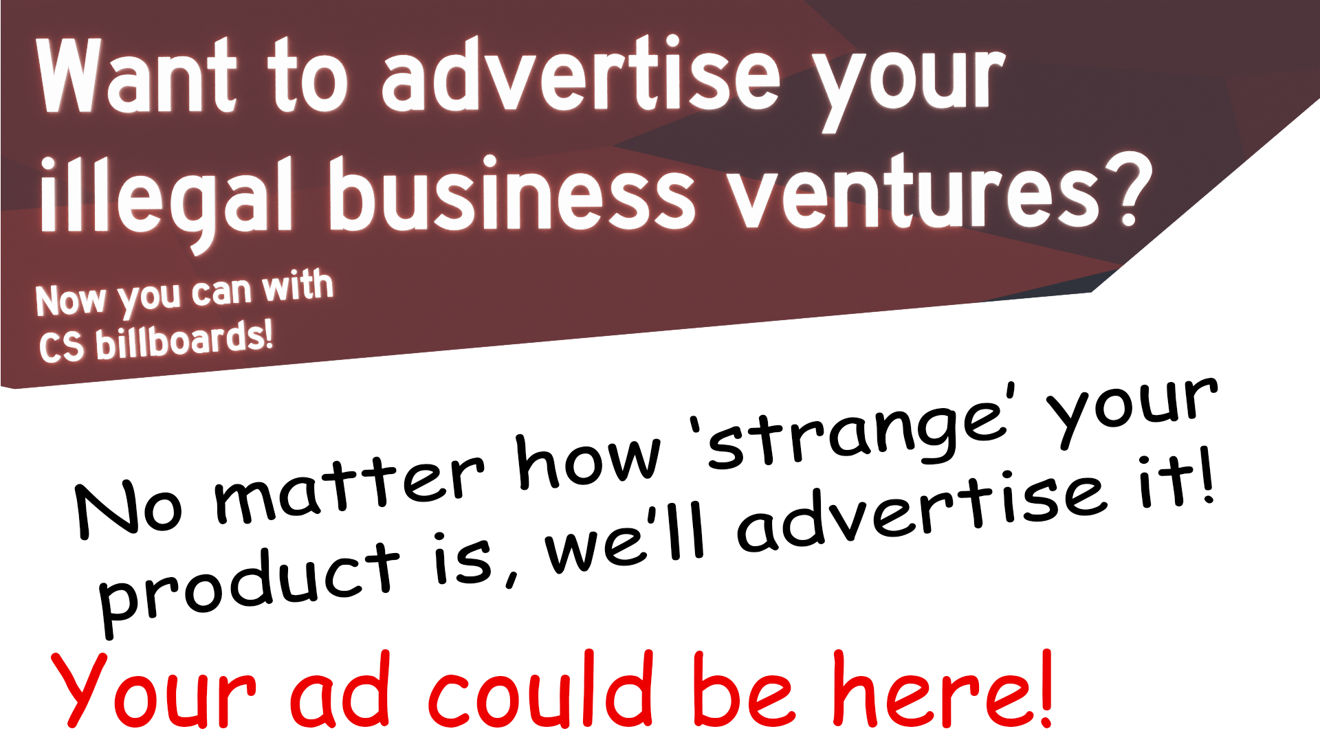 Recently, for a project, I’ve made a few fun little billboard advertisements, as a way to fill up the map, and wanted to see other’s opinions.