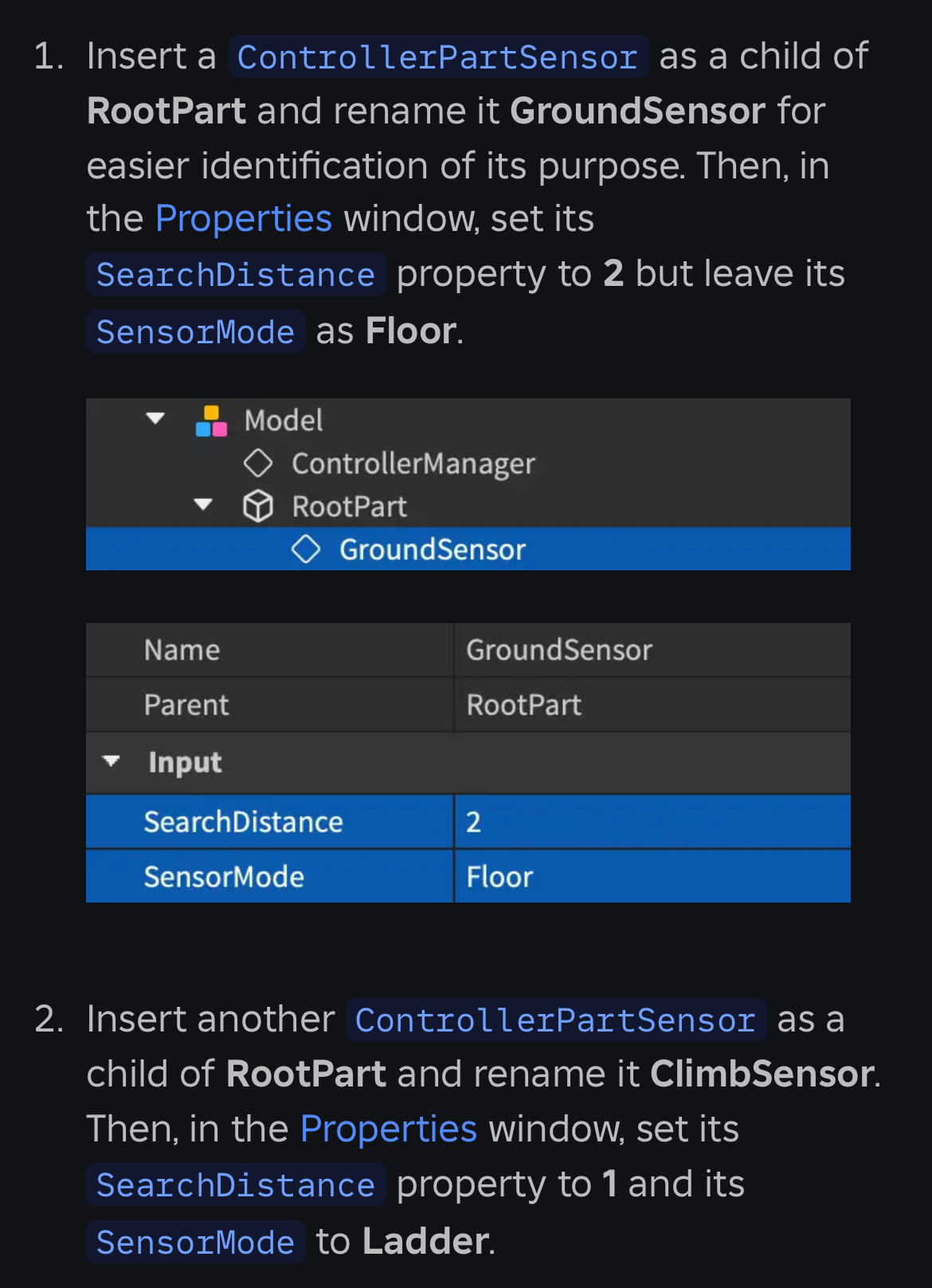 These sensors referenced are ControllerPartSensors that have been named things like “GroundSensor” and “ClimbSensor” to better indicate how they are being used. This is just for future reference and readability by the developer, but the article explicitely states that these instances are both ControllerPartSensors: