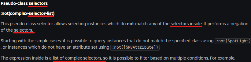 I’ve added an example of a :has(:not()) combo in the docs (last line in the " Pseudo-class selectors" code example), hopefully showing a practical example of usage in a game.