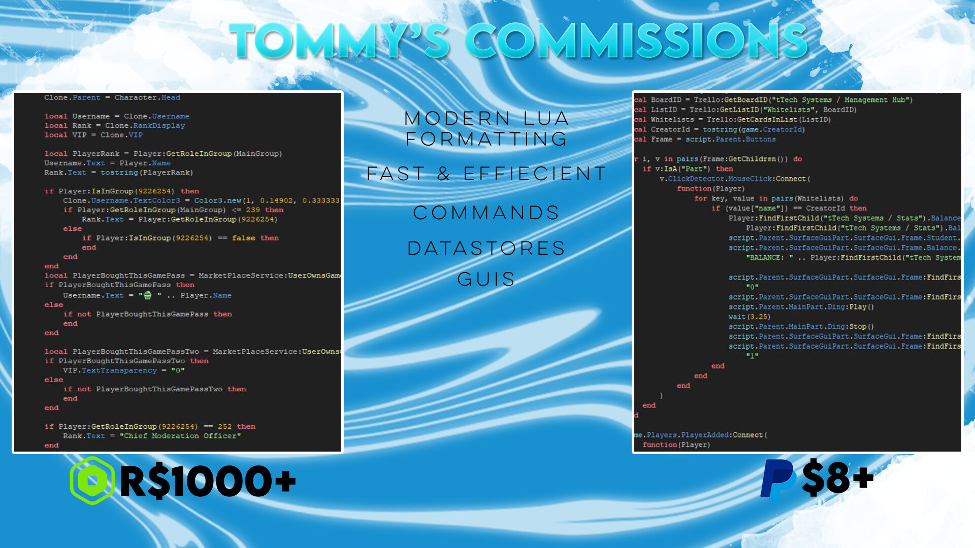 Hi there! I’m Tommy and I’m offering my services as a scripter. I have been scripting for over a year on Roblox and am looking for fast, short-term commissions.