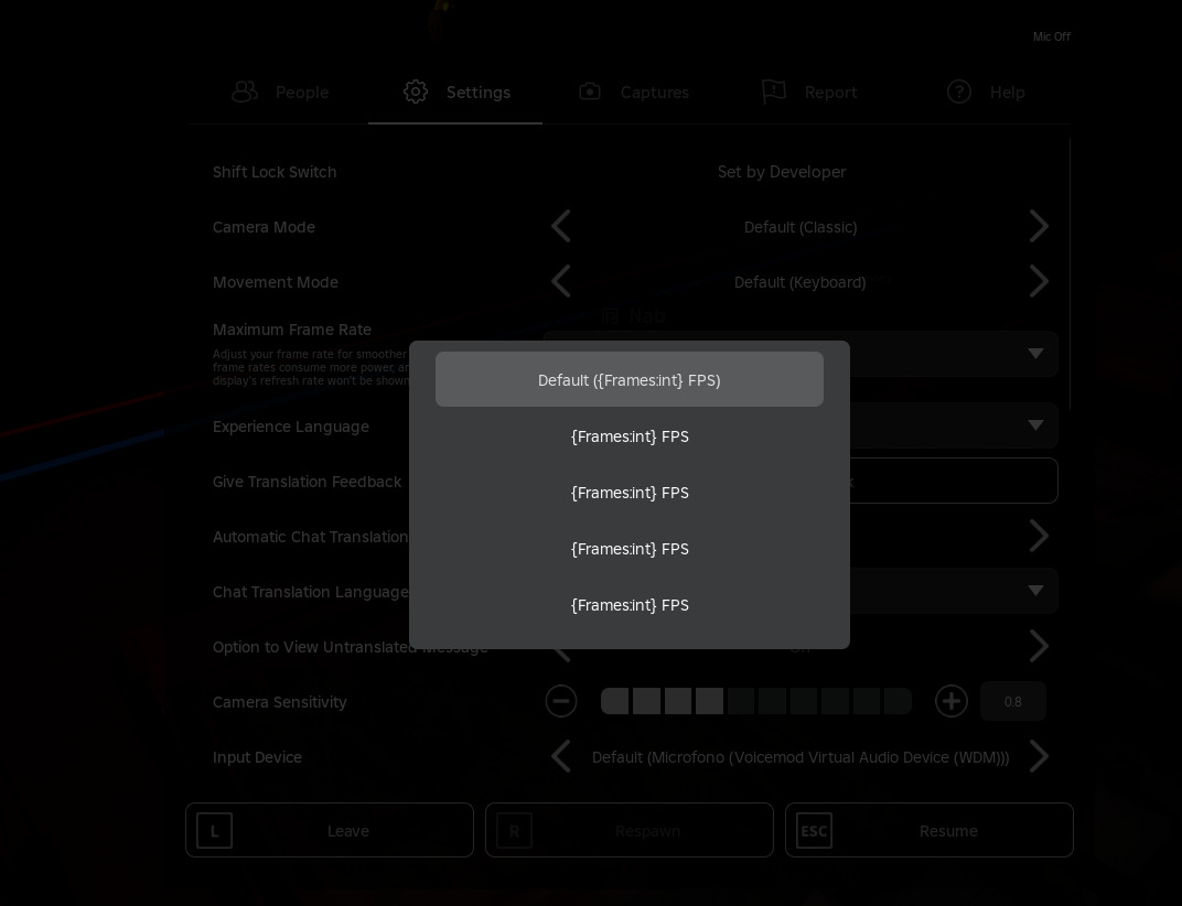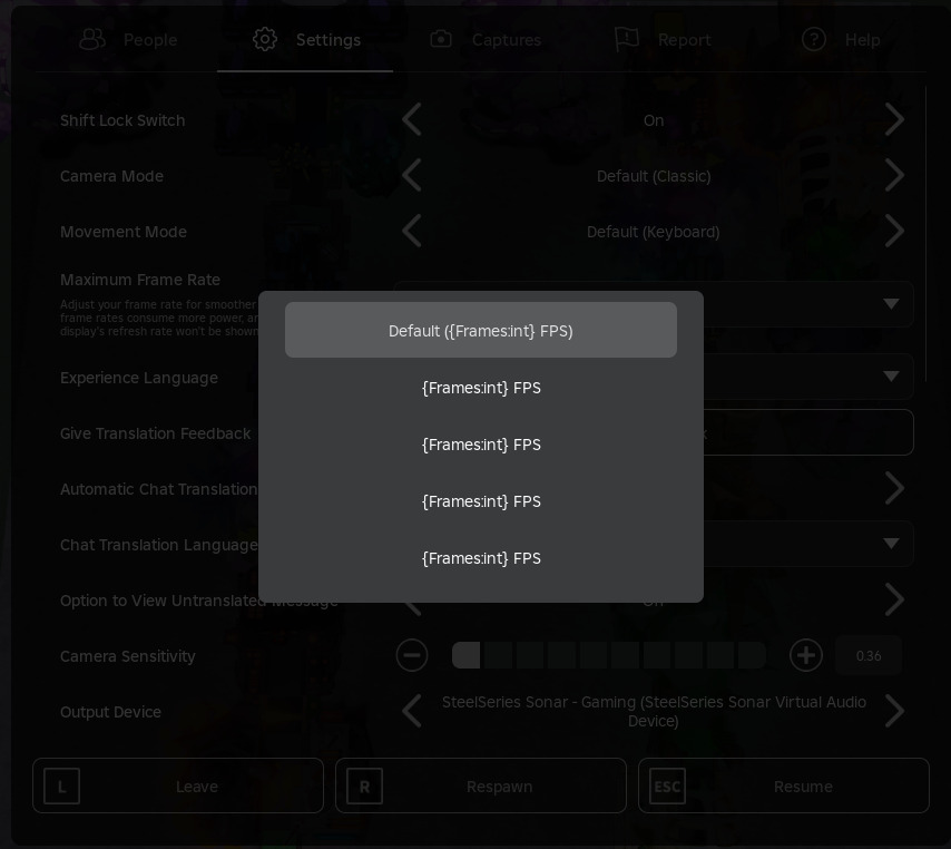 on the Maximum Frame Rate setting, instead of displaying the FPS cap (such as 240 FPS, 60 FPS, 120 FPS), it instead shows {Frames: int}, which is very weird