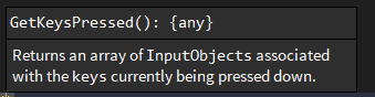As seen in the image, UserInputService:GetKeysPressed() returns {any} instead of {InputObject}