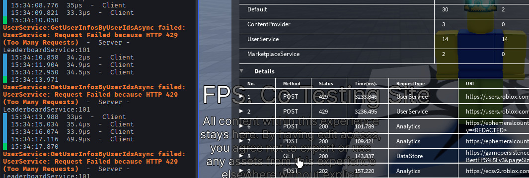 While using UserService:GetUserInfosByUserIdsAsync in my game, I am often getting the error Request failed because HTTP 429 only in RCC ( not in Studio )