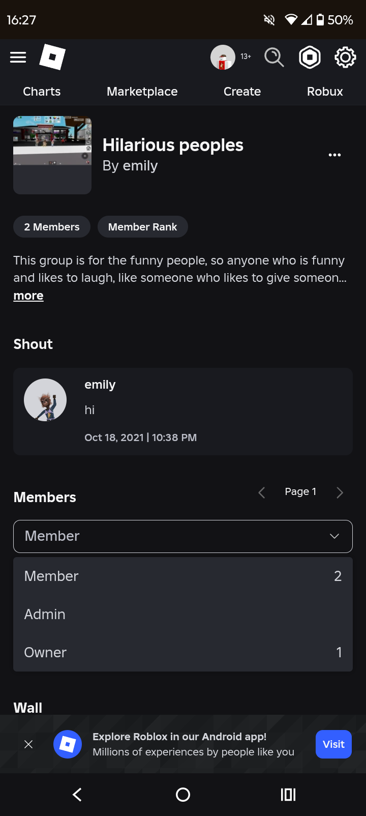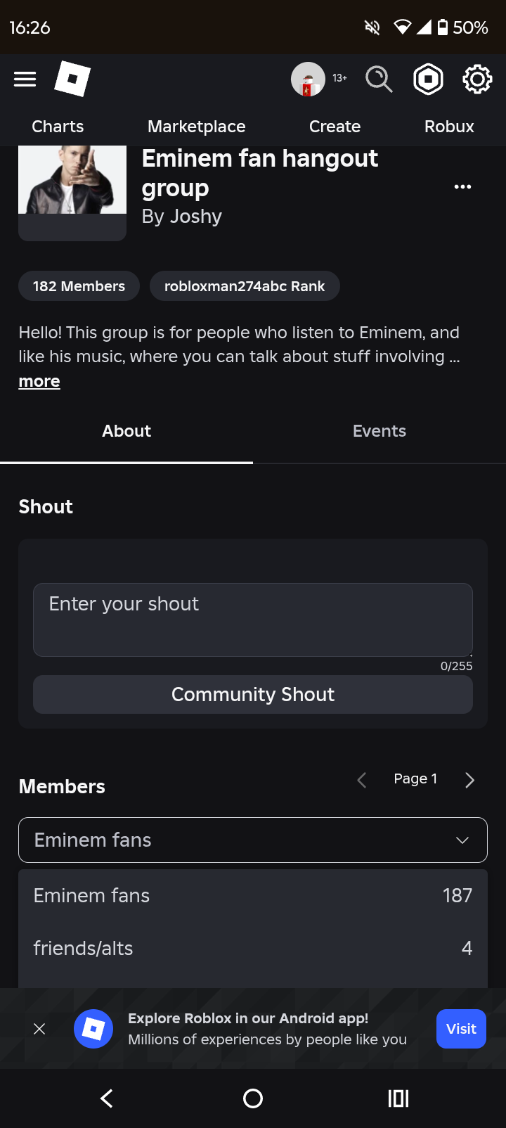 Hello, I own a few groups in roblox. The biggest of the latter is called eminem fan hangout group, with 182 members. Well, it says 182 members. If you scroll down and click on the roles, it will show that there is 192 members.