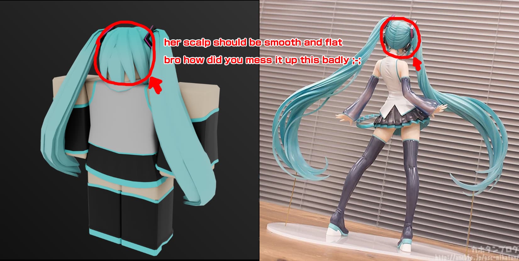 Thanks for your feedback but I can definitely work with remodeling her hair again since that was the 2nd remodel I am trying to do my best to make it fit onto a roblox head which has been challenging even for miku and when I do try to curve it on the head it kinda looks too flat as others told me before same goes for the thickness sometimes, so I guess I need to find that balance and maybe do a bit more strands. I’ll most likely download this asset in studio and use it as a reference. Thanks again