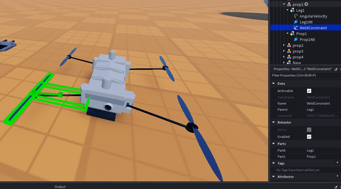 one drone uses a motor6d from the DroneArm to the Propeller for all arms while the other one uses two attachments and a hingeconstaint