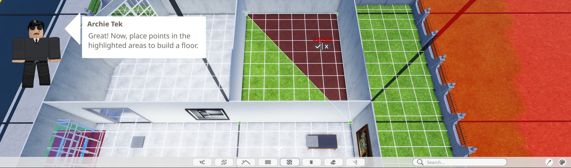 The “highlighted area” initially confused me and I was trying to build in the big red highlighted area and it took me a while to notice the tiny cubes on the floor telling me where to build.