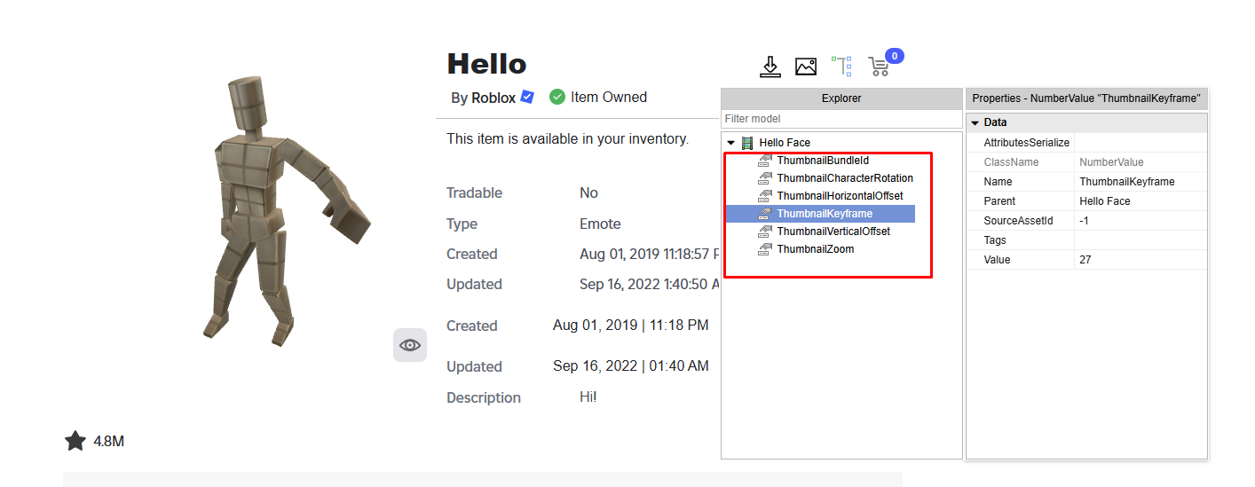 As you can see in the image below, emotes include thumbnail data. However, UGC emotes don’t include this data unless the developer added it. If not have, how can I find out which keyframe the thumbnail was rendered in?