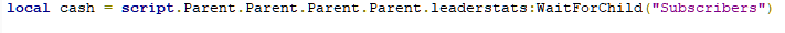 local cash = script.Parent.Parent.Parent.Parent.leaderstats:WaitForChild(“Subscribers”)