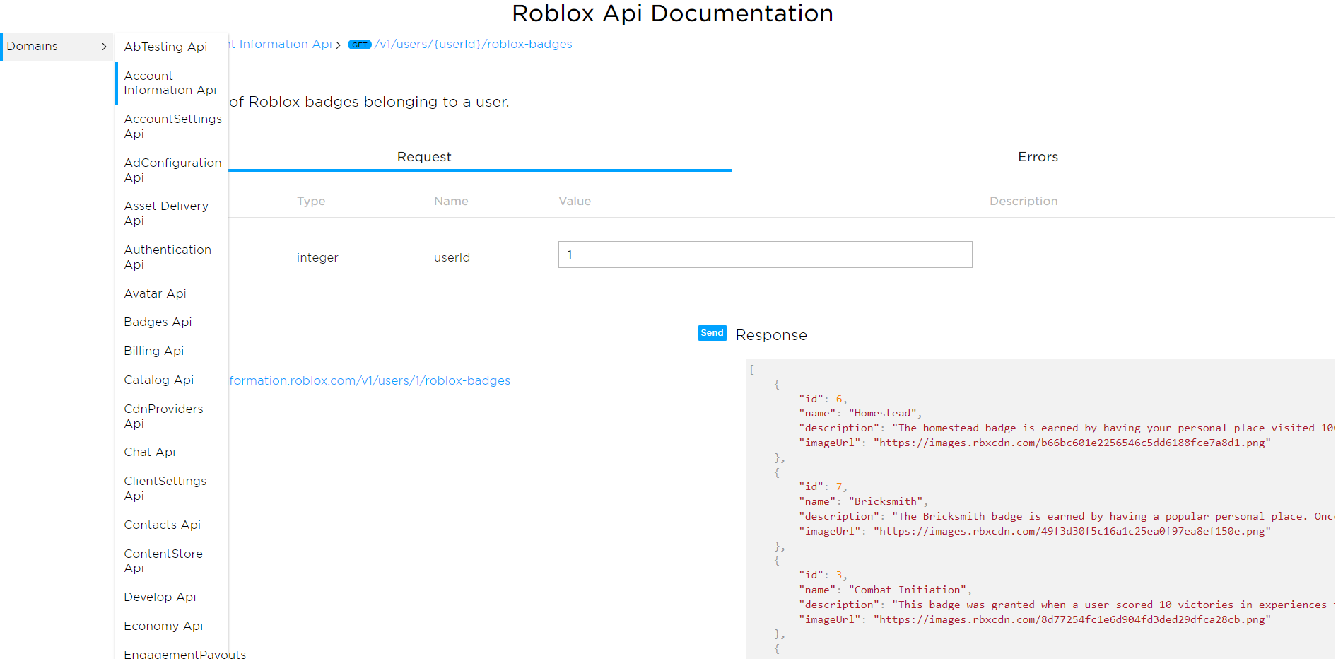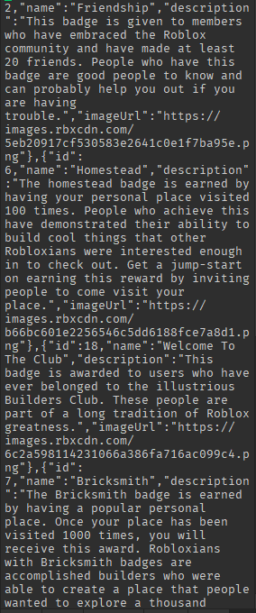 I’m having some issues with the Roblox API (it’s my first time using it) and I can’t get the JSONDecode from the Official Roblox Badges.