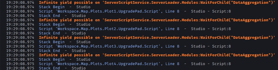 Also I noticed that it doesn’t print an InfiniteYield warning right now for “PlayerDataModule”, which I require first, when I didn’t wrap into :waitForChild() it printed 2 errors for PlayerDataModule and for DataAggregation.