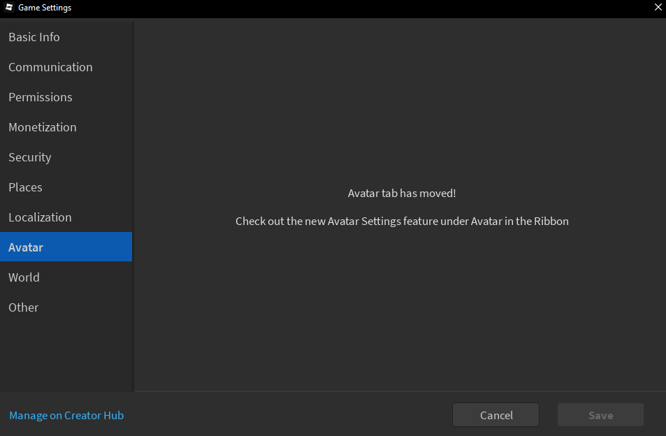 What happens when I try to change avatar settings from the old Avatar tub under Game settings: