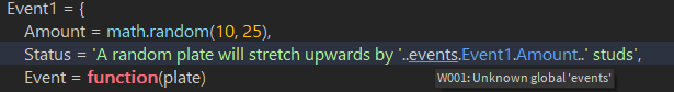 Status = 'A random plate will stretch upwards by '..events.Event1.Amount..' studs', -- the line outputting the error