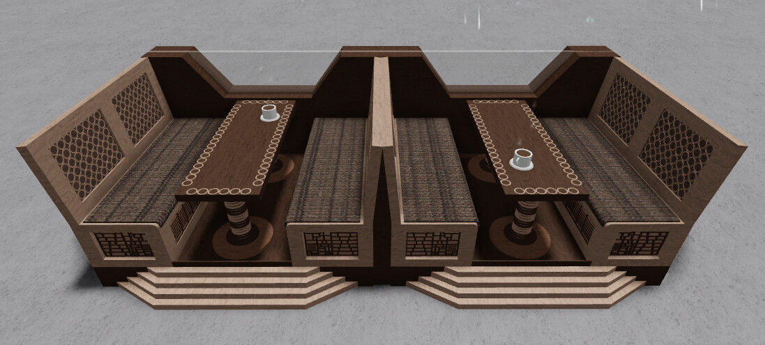 sofa chairs look great, table looks good, not so sure about the circles on the table but I can see it working, I think all you need to do is actually use the asset and then adjust it to fit the theme there