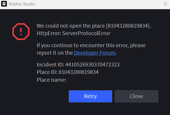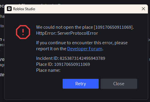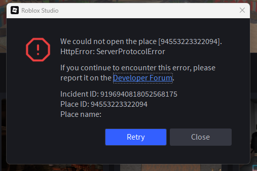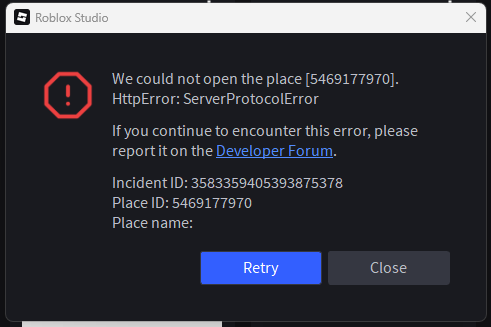 I tried logging out and logging back in through Studio just now, it’s still showing me this error whenever I try to open up this specific place of mine in Studio.