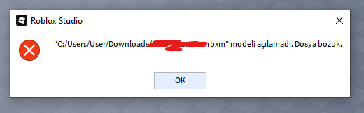 Guys, Im trying to add rbxm file for my new game but Im getting this message. This is Turkish Language but I can translate it to you. It says file is not could be opened,file is corrupted. I get this message always I cant add any RBXM files.