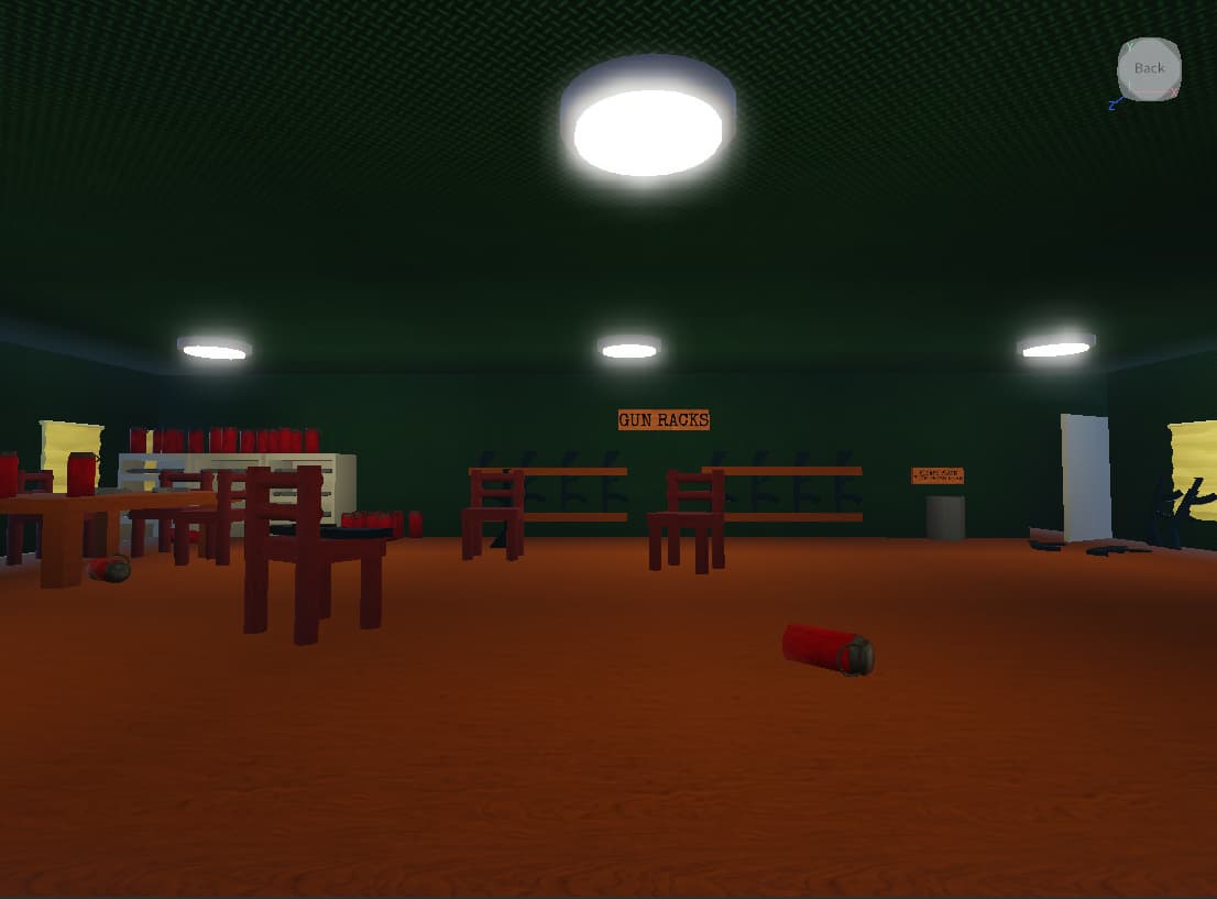 Does this look better? I added 2 more lights and I added chairs. Also I reduced the insane amount of canteens to equal the amount of beds instead of the amount of pistols.