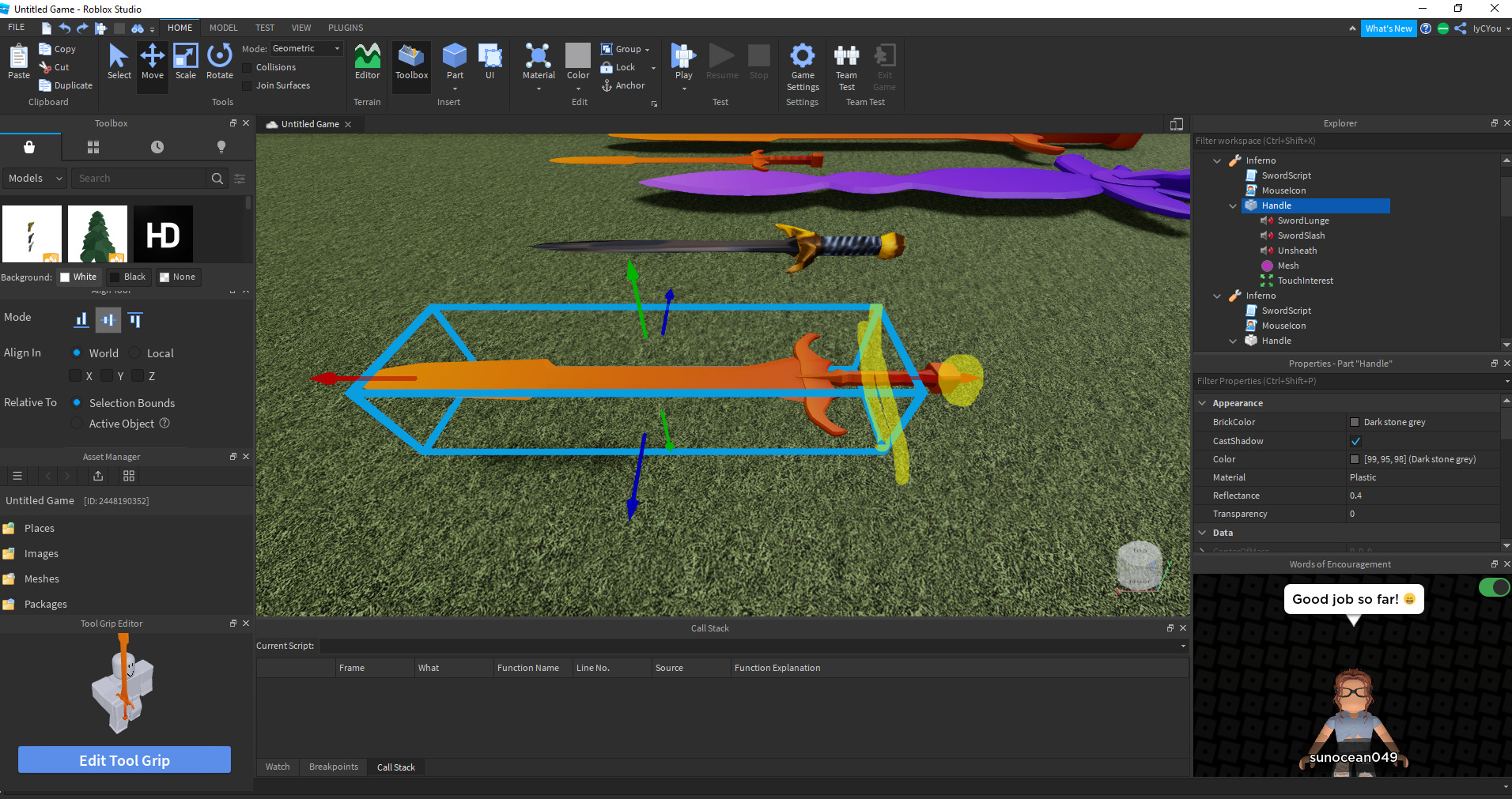 Hello, so I am trying to make a sword game, and I’ve recreated the ROBLOX sword mesh, and replaced the special mesh with my own mesh… I want the handle bounding box to align with the bottom of the sword, but where ever I move the handle my mesh still stays aligned. Now I can align it via the position properties that are given in the special mesh, but that isn’t accurate. I want it to be aligned perfectly… and there is no other way to do it.