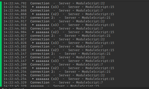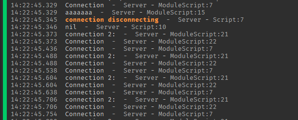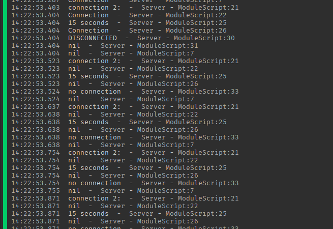 after 10 seconds the heartbeat connection gets disconnected in first server script (the script returns the connection while calling module to disconnect again) and prints connection as nil as it should be. but the thing is that the module script keep printing connection as “Connection” even though the connection is disconnected