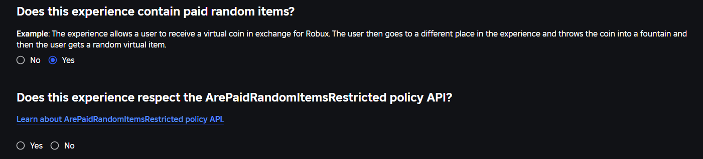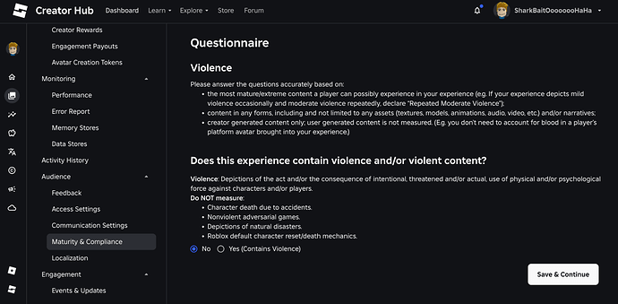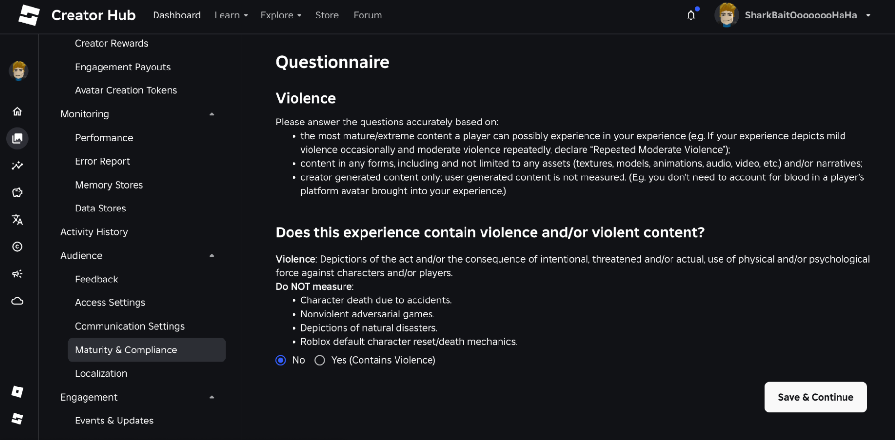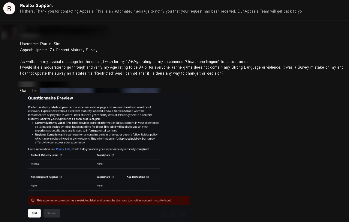 We believe every public experience on Roblox should have a content maturity label so users and parents can make informed decisions about experiences they play. To achieve this goal, we are asking creators who have not already, to complete the Maturity & Compliance questionnaire by September 30, 2025 to ensure their experiences remain playable. We are also sharing details on how we intend to keep legacy Roblox experiences available even if the developer is no longer active.