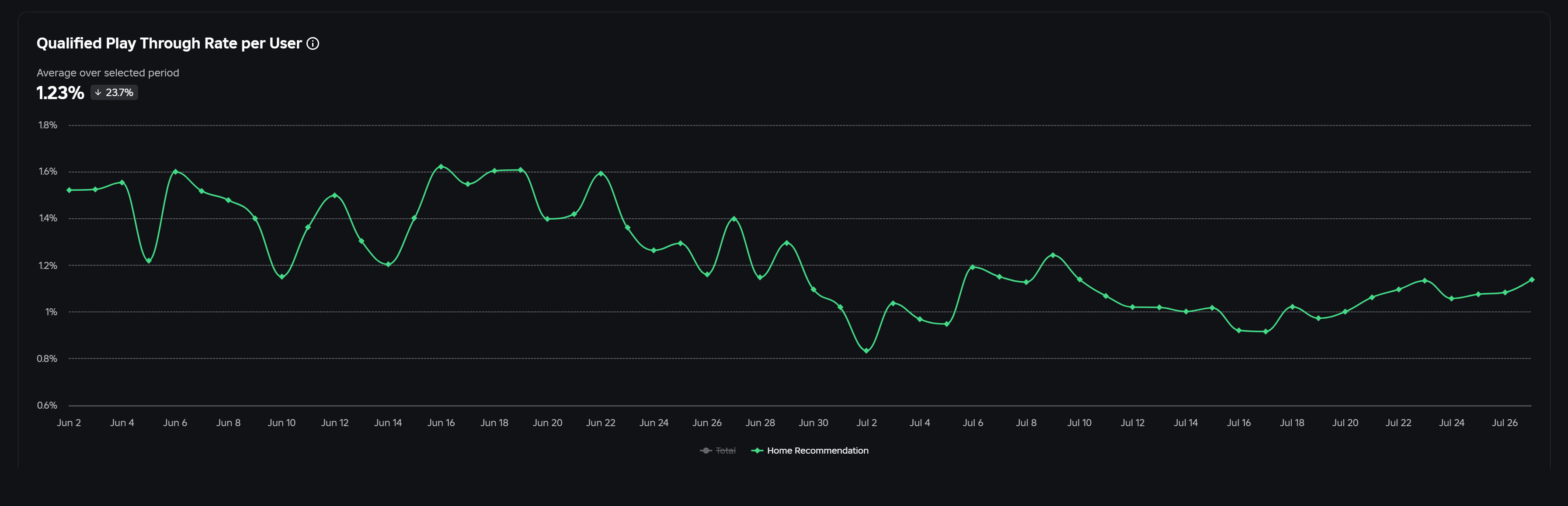 Qualified play through rate (recommendations) = Qualified plays divided by impressions for Home recommendations => That means this is on a per impression basis and the same user can have multiple impressions
