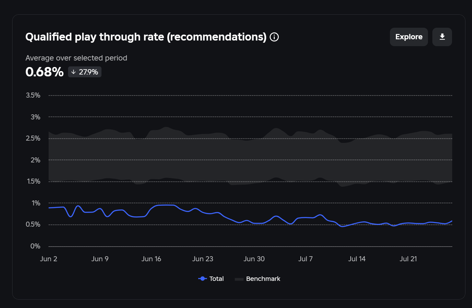 I recently went through a few old games of mine to check some old analytic information and I noticed there were some inconsistencies between graphs and tables for qualified play through rate for recommendations. The game I was looking at had a sharp drop a while ago where the qualified play through rate dropped from ~2-2.5% for home recommendations to .5-.6% which prompted me to investigate some data so I could determine the cause. However when I was looking through different sources for home recommendation qualified play through rates I noticed they all showed different results despite the label for them being the same. The graphs are from qualified play through rate for users filtered for home recommendations, qualified play through rate (recommendations) and the table produced under the acquisition tab