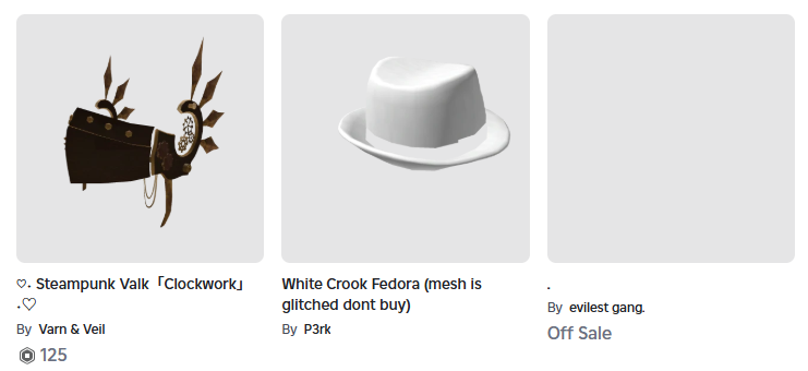 You can see the price in robux when an item is available, it reads ‘free’ when the item can be taken for free and it reads ‘off sale’ when the item isn’t for sale. Then a lot of the time there’s these items that don’t show anything.