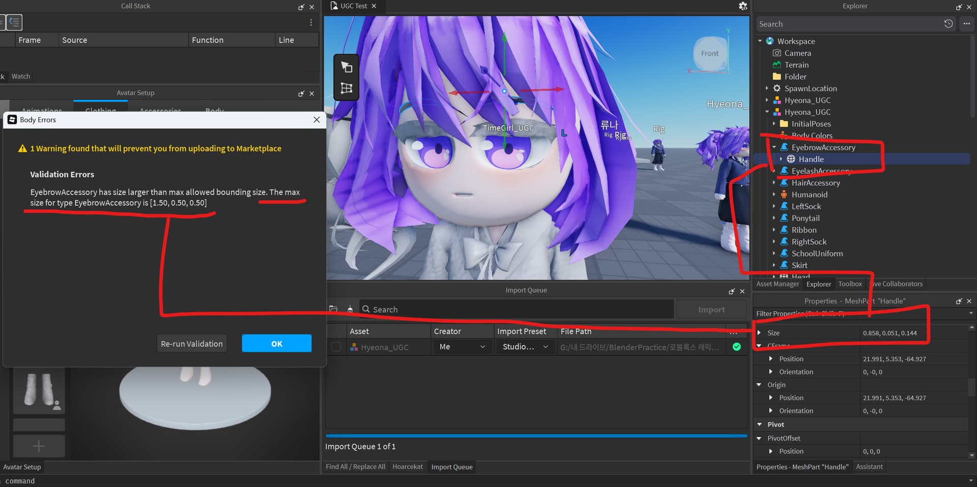 Even though the eyebrow accessory’s handle size is within (1.5, 0.5, 0.5), UGC validation still blocks the upload due to a size issue.