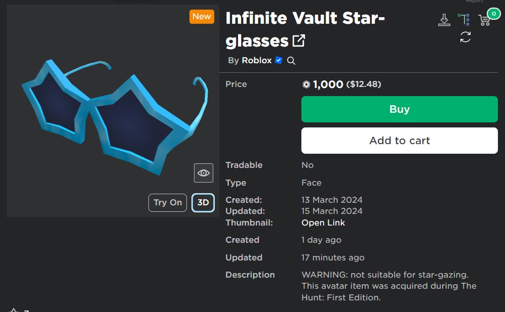 Theirs currently a issue with the Limited item “Infinite Vault Star-glasses” with its original price being showed as “0” when in reality it was 1,000 Robux as shown below