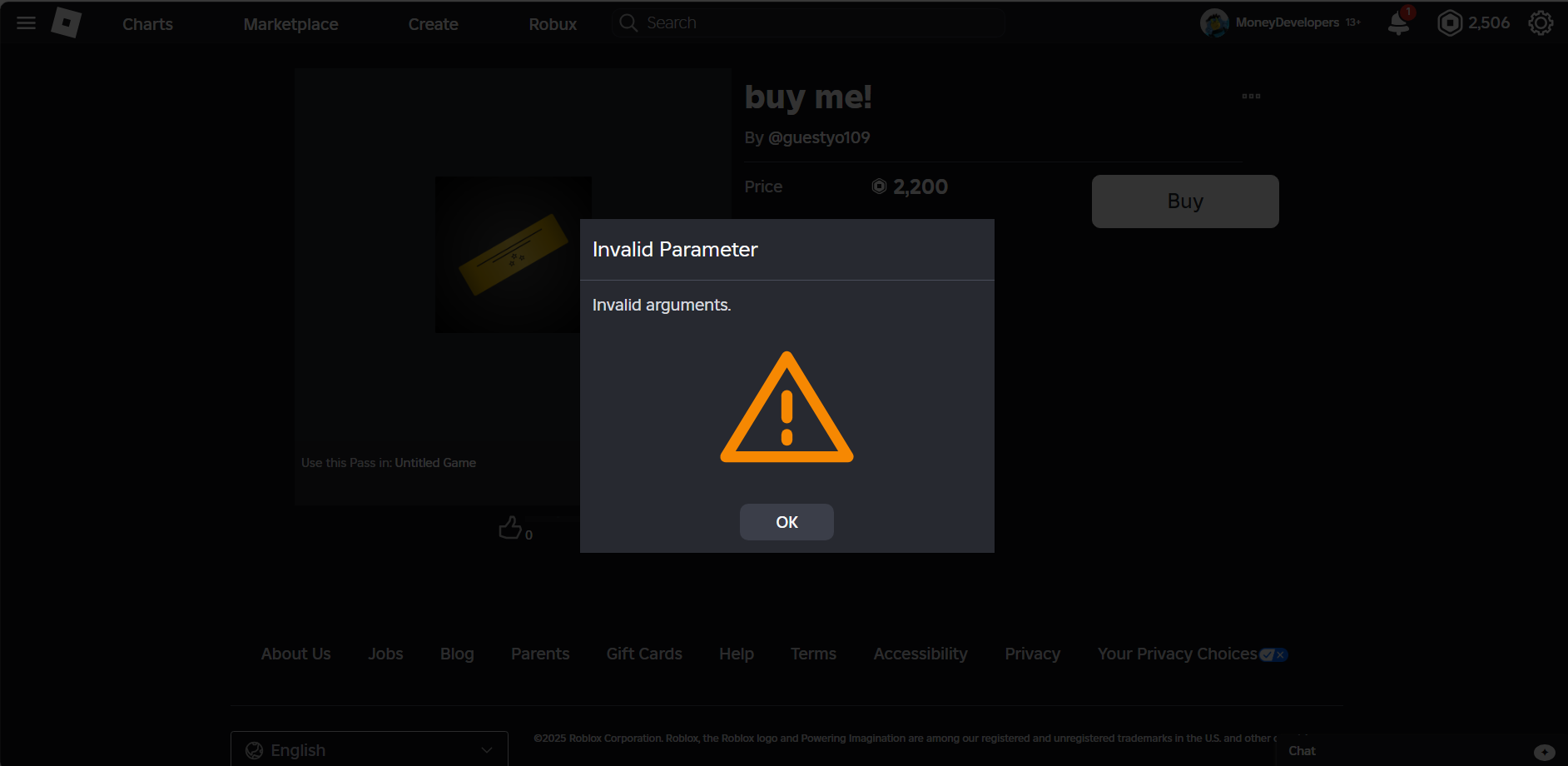 and it says Invalid Parameters when trying to purchase it as seen in screenshot below: