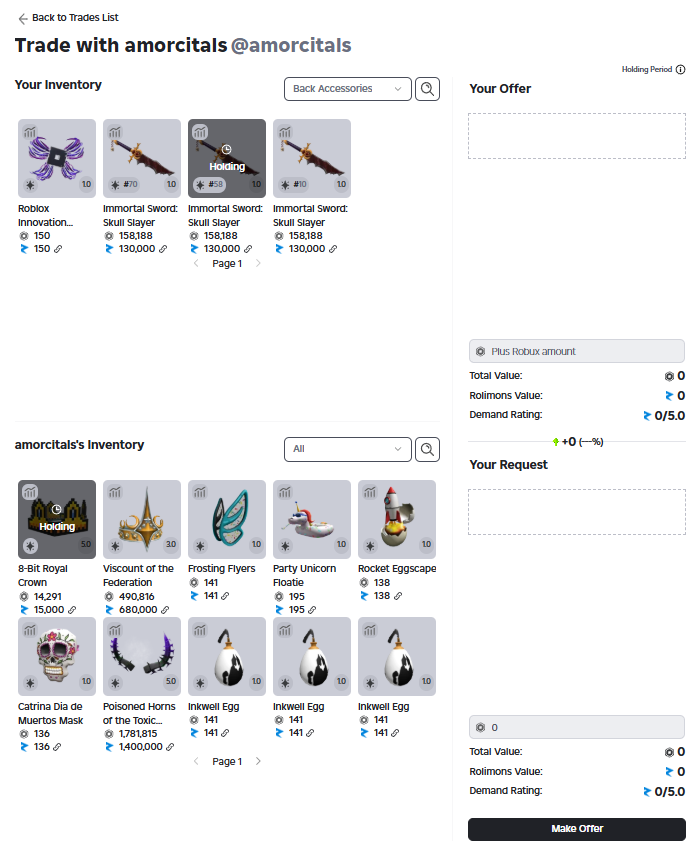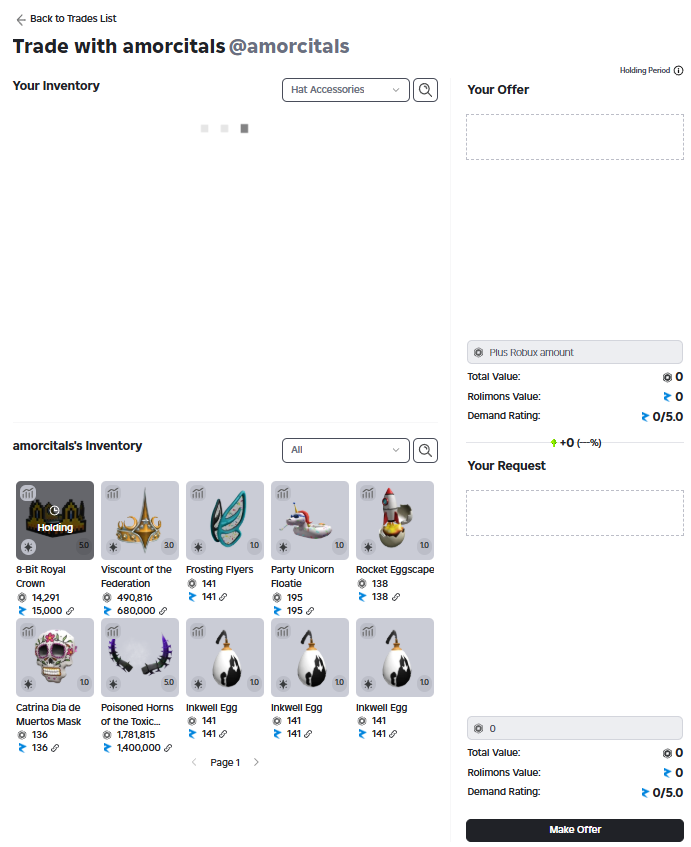 Hello, I’m currently facing an issue previously reported and marked as fixed. Basically whenever I try to send a trade to any user, my inventory tab gets stuck in loading. This happens when browsing for “all” categories or “hat” categories, it works properly with other categories. My guess is that there’s at least one hat accessory which is failing to load and causing this.