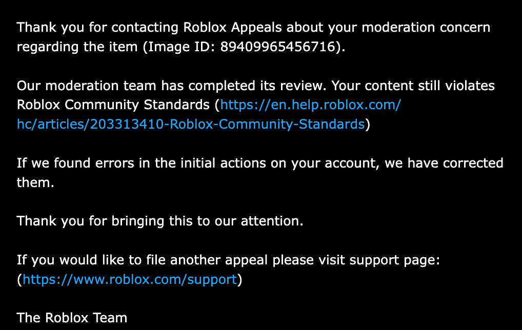 The Roblox support email isn’t automation (at least from what I’ve seen) I’ve got stuff unbanned from that so yeah. Let me know if that helps.