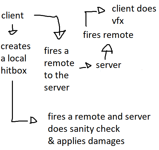 So, to put it short, I have the client that fetches the animation and data of the attack from a Module Script, creates a local hitbox and fire a remote to do server sanity checks while in parallel, I have another remote that is gonna send all clients the position and the Instance of the VFX/SFX.