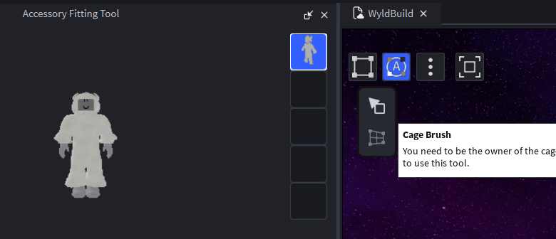 - I tried using the Accessory Fitting Tool to see if I could make cage updates inside of Roblox Studio, but this thing seems really angry and confused about the owner of the cage. I have a business I’m developing under, so there’s me and there’s my business involved in all this, but no one else. Whether I load it with me as the creator or my business as the creator, Studio doesn’t want to give me access to the Cage Brush.